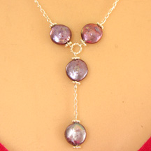 Coin Pearls are one of the new freshwater pearl industry wonders of the last few decades and lend themselves to wonderful designs like this one. These lovely hued violet pearls float around your neck on delicate sterling silver link chain to climax in this center dangle.